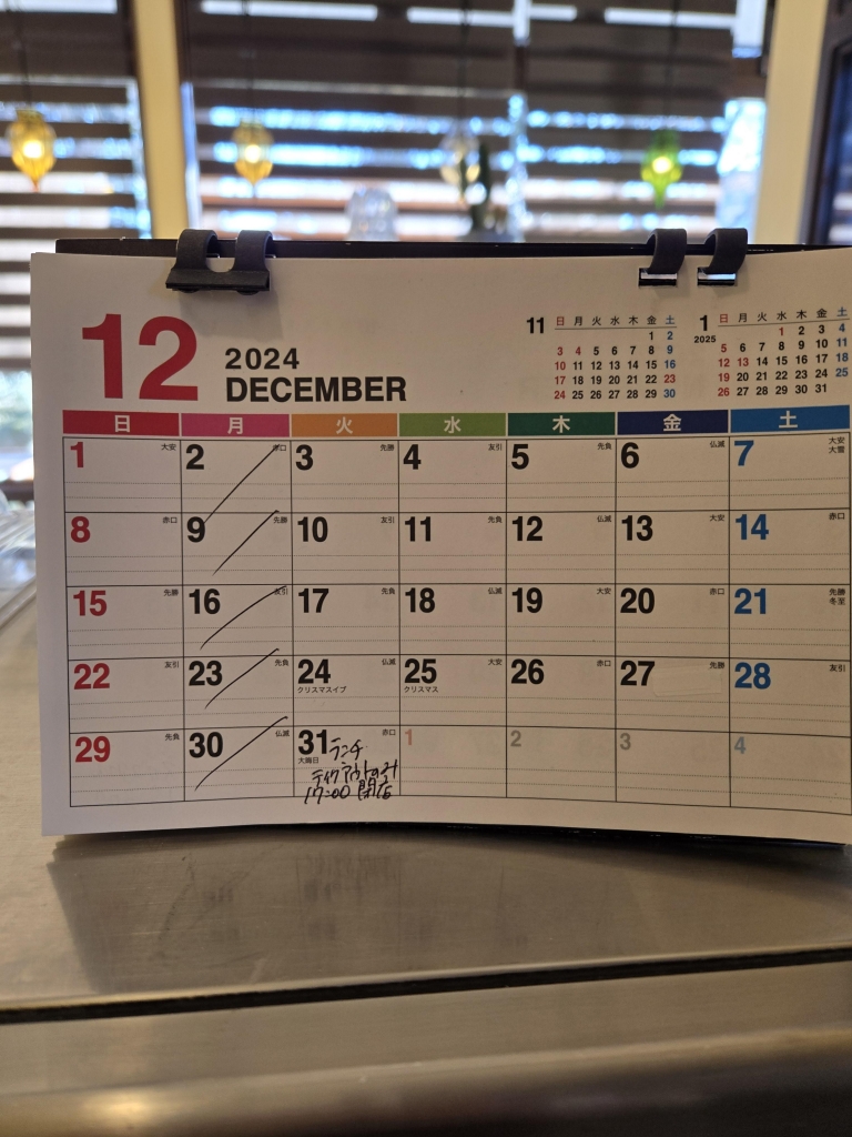 年始は3日から営業しております。1月は月曜日定休以外に13日〜20日まで冬期休暇を頂戴しております。ご迷惑をおかけしますが宜しくお願いいたします。